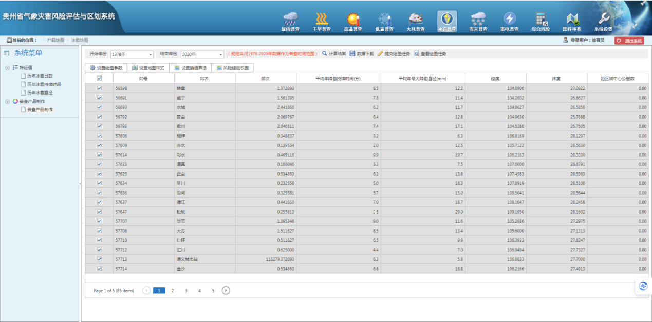 系统模块包括:暴雨普查、干旱普查、高温普查、低温普查、大风普查、冰雹普查、雪灾普查、雷电普查、综合风险计算与制图、图件审核和系统管理11个模块。